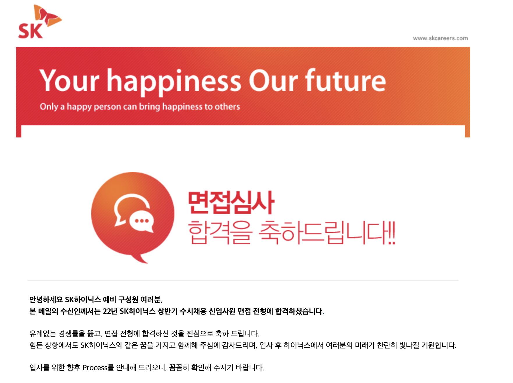 건강검진, OT까지 모두 참여했지만 최종적으로는 입사하지 않았습니다. 너무나 좋은 회사지만 제가 좀더 하고싶은 일을 하는 것이 맞다라는 생각이들어 입사를 포기하게 되었습니다. 오랜기간동안 전형이 진행되는 만큼, 개인적으로 마음을 다잡기가 힘든순간이 여러차례 왔습니다. 결과메일이 언제올까 노심초사하게되고, 다른 지원자 분들과의 비교를 통해 나의 답변이 틀렸나 라는 생각도 들었습니다. 하지만 그럴때마다, 조금 더 직무에 대한 이해도를 높이려 공부를 하였고, "지금 할 수 있는 일을 하자" 라는 마인드로 마음을 다잡으려 노력하였습니다. 채용과정을 거치면서, 반도체 산업과 IT직무에 대한 부분도 자세히 알게되었지만, 정신적으로 더 성숙해졌다는 생각이 듭니다. 후배가 하이닉스 하반기 지원 시작했는데 막막하다라는 말을 듣고 최종합격수기를 작성해보았습니다. 제글이 도움이 되길 바라며, 궁금하신 점은 댓글로 남겨주시면 아는선에서 답변해드리도록 하겠습니다. 감사합니다.