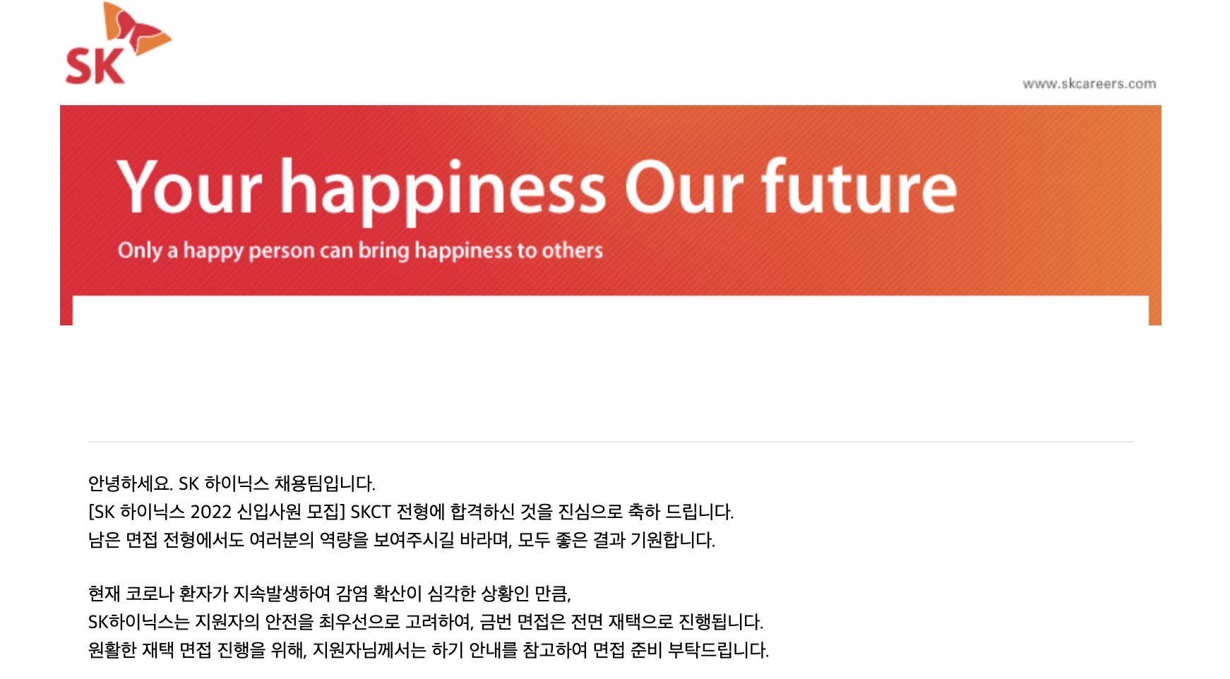 2022년 상반기 하이닉스 신입 공개체용에 ✨최종합격✨ 했습니다. 제가 지원했던 직무는 IT 직무이며, 이천에 위치하고 있습니다. 당시 자격요건에는 4년제 학사 이상 졸업(예정)자이며, 전산/컴퓨터/산업공학/경영정보학/전기/전자/반도체 등 관련전공자라는 조건이 있었습니다. 채용 전형은 서류전형 -> SKCT ( IT는 코딩테스트와 인성검사) -> 면접전형으로 3가지의 단계로 진행되었습니다. 비록 최종적으로 하이닉스에 입사하지는 않았지만, 각 단계에 대한 후기와 꿀팁을 적어보려합니다. 지원하고자하는 많은 분들께 도움이 되길 바라며, 혹시 궁금하신점이 있다면 댓글로 달아주시면 됩니다.