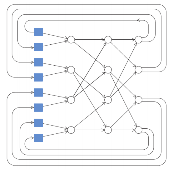 2) Omega network: 2*2 크로스바 스위치를 사용하여 스위치 개수가 적게 필요하다. 프로세서의 개수가 n일때, log n 단계에 걸쳐 스위치를 배치시킨다. 하지만 출발지와 목적지가 다르다고 언제나 동시에 통신이 가능한 것은 아니다.