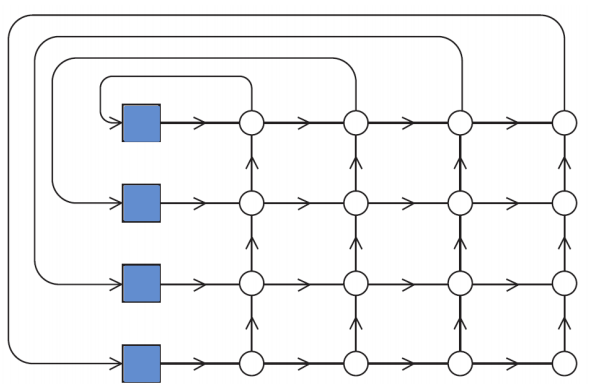 각 스위치는 "프로세서와 메모리쌍"에 직접 연결된다. 스위치들끼리도 서로 연결되어 있다.