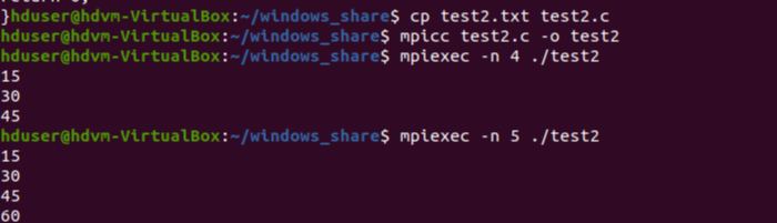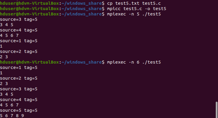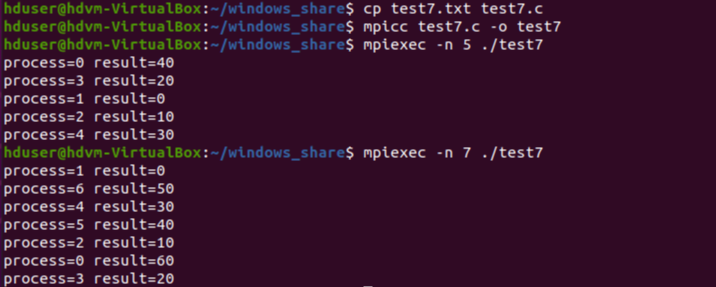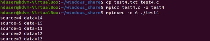 메세지를 한번에 받아 배열에 저장한 후, 배열에 들어있는 결과값을 출력하는 형태의 프로그램이다. 이 프로그램에서는 순서를 지정하지 않고, 받을 때 status.MPI_SOURCE를 이용하여 프로세스의 번호를 같이 저장하였기 때문에 순서를 지정한 경우보다 더 빠르게 실행될 수 있다.