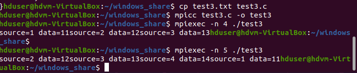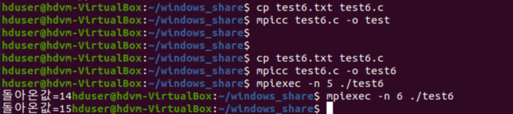 process0에서는 data를 먼저 보내고, 마지막에 받아야하며 나머지 process들은 data를 먼저받고 마지막에 보내야하는 것을 유의해야한다. 모든 노드를 방문하고 마지막에 process0으로 왔을 때, 출력되는 프로그램이다.