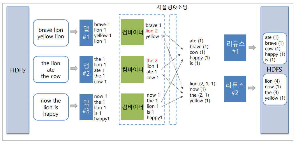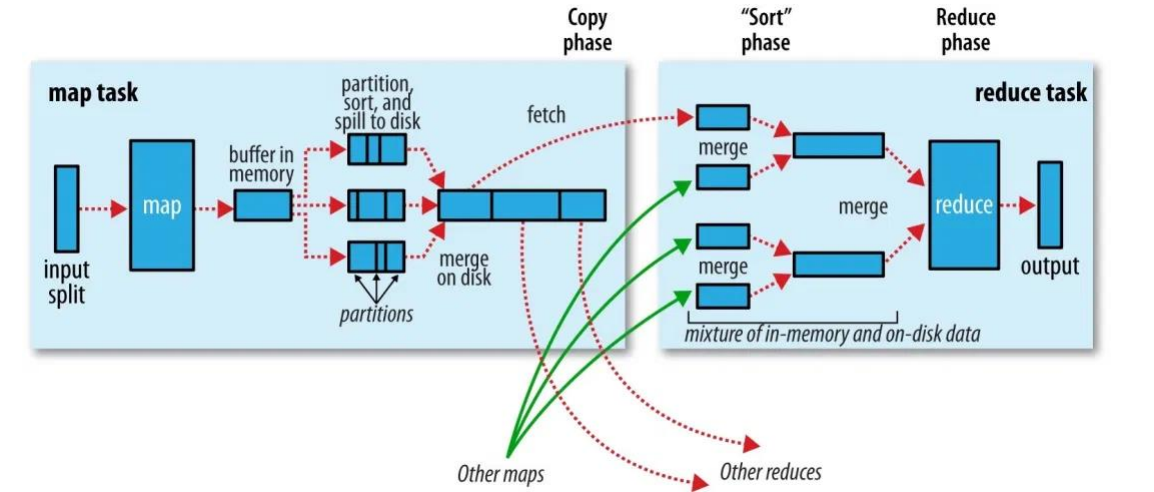 ex) M개의 맵테스크와 N개의 리듀스 테스크가 있다고 하자. 맵 테스크가 종료된 후, 각 리듀스 테스크는 M개의 맵테스크들과 각각 연결은 맺고 자신에 해당하는 파티션 데이터를 읽어간다. 이를 Shuffling이라고 한다. M*N개의 네트워크 커넥션이 맺어지고, 데이터가 네트워크를 통해 복사된다. 이때 전송되는 데이터의 양이 크다면, 네트워크 대역폭이 병목 지점이 된다. 리듀스 테스크는 모든 맵 테스크에서 데이터를 가져온 후, 이들을 하나로 병합한다. 합병된 데이터에 대해 key를 기준으로 sorting을 한다. sorting이 끝나면 레코드들을 전체적으로 스캔하면서 레코드들을 그룹핑한다. 즉, 같은 키를 갖는 레코드들을 하나로 묶어서 하나의 reduce 입력 레코드를 만든다.