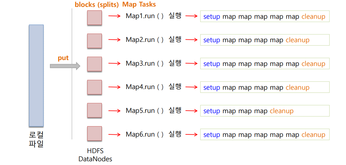 맵테스크는 입력파일의 개수보다 작을 수는 없다. 작은 크기의 입력파일이 너무 많으면 맴 테스크의 수도 많아져서 실행효율이 떨어진다. 입력파일이 크면 데이터 블록(128~256MB)로 나뉘고, 맵 테스크는 블록마다 1개씩 할당된다. 압축되는 등 분할이 어려운 경우에는 블록 수에 무관하게 전체 파일에 맵 테스크 하나가 지정된다. InputFormat 클래스에 isSplitable 메소드를 사용하여 블록 단위로 나눌 수 있는 것인지 없는 것인지 지정해 줄수있다.