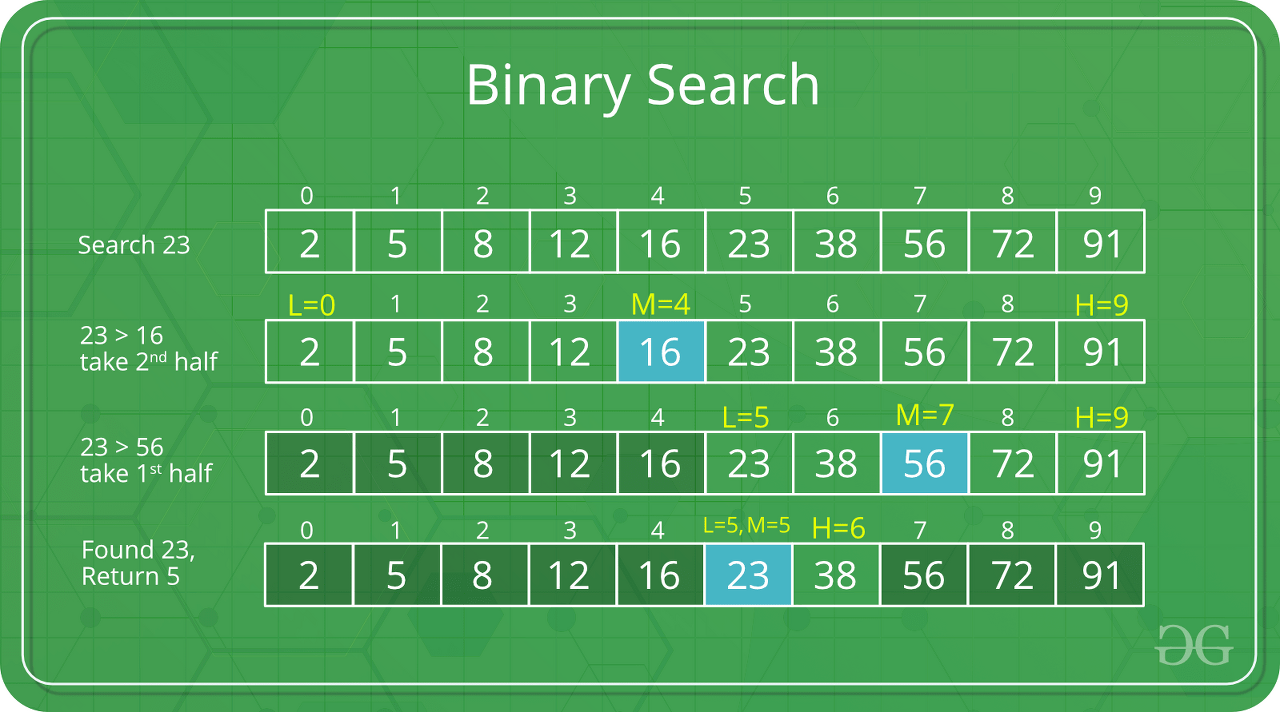 이진탐색은 이미 정렬된 배열에서, 특정한 숫자를 찾는 정렬 알고리즘이다. 찾고자하는 숫자를 배열의 중간값과 비교하여, 만약 작다면 왼쪽을 다시 탐색, 크다면 오른쪽을 다시 탐색하면서 숫자를 찾아낸다. 원하는 값을 찾아내면 탐색은 종료되며, 존재하지 않는다고 판단하여도 탐색을 종료한다. 존재하지 않는다고 판단하는 기준은 탐색할 인덱스가 없을때 이다. 구현방법은 반복문을 사용할 수도 있고, 재귀를 사용할 수도 있는데 아래의 코드는 재귀를 사용하여 구현한 것이다.