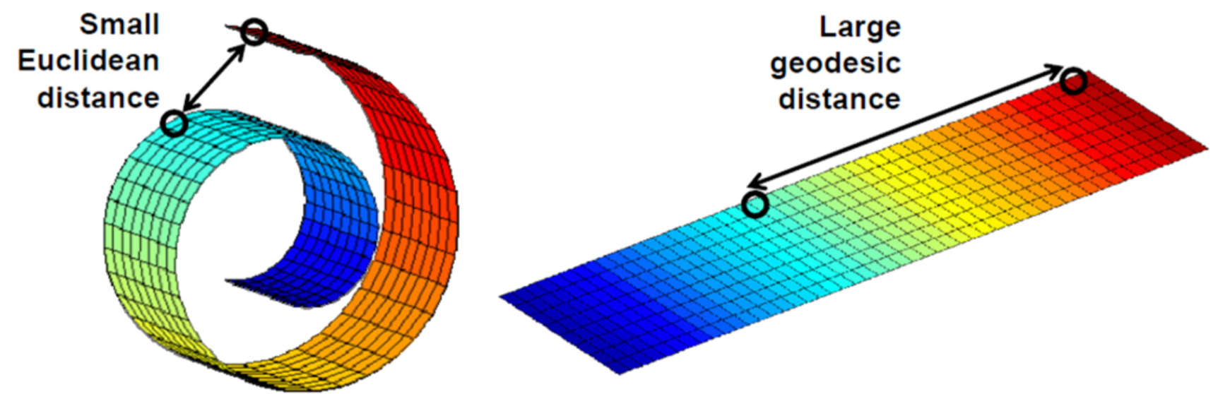 매니폴드 가설이란, 높은차원에 존재하는 데이터들의 경우에는 실제로 해당데이터들을 아우르는 낮은 차원의 매니폴드가 존재한다는 것을 말한다. 3차원의 공간에 분포한 데이터를 구부러진 2차원으로 표현한다면, 선형 투사하여 생긴 손실을 줄일 수 있을 것이다. 또한 고차원에서 가까울지라도 저차원의 매니폴드에서는 거리가 오히려 멀어질 수 있으며, 저차원의 공간상에서 가까운 점은 비슷한 특징을 갖는다는 것을 알 수 있다. 대부분의 딥러닝이 차원축소를 수행하는 과정은 고차원상에서 매니폴드를 찾는 과정과도 같다고 할 수 있다.