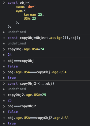 얕은복사를 하기 위해서는 1) assign함수이용 2) 전개연산자 이용 이렇게 2가지의 방법이 있다.