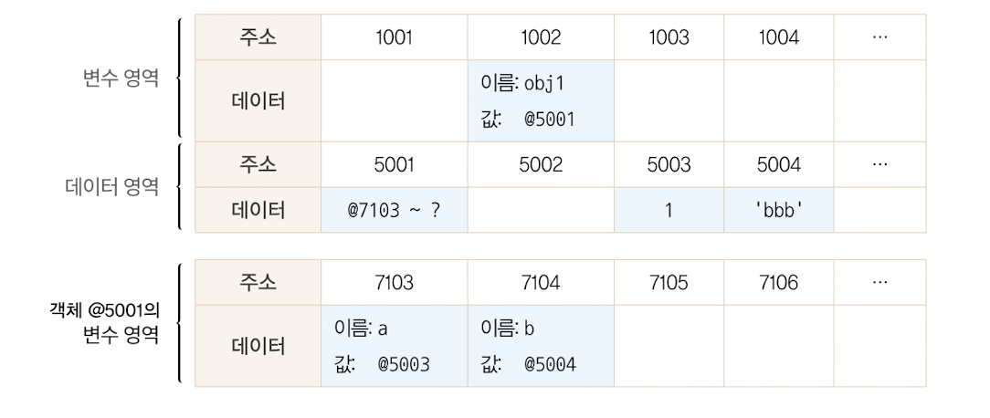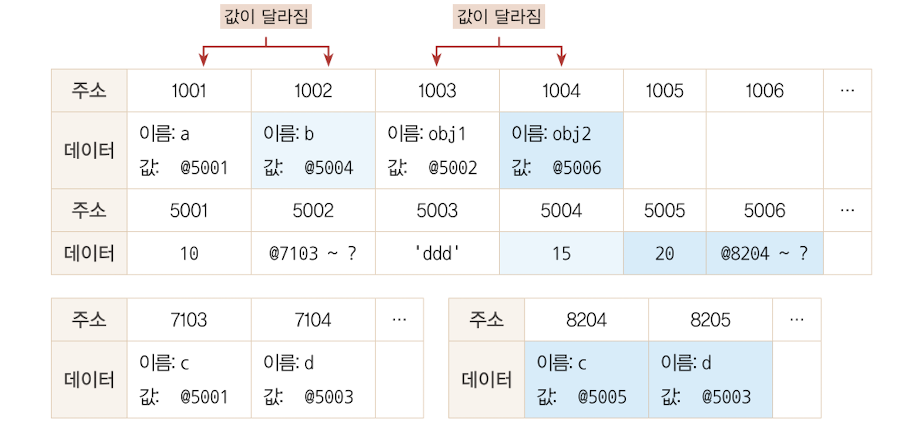 기본형은 불변값이고, 참조형은 보통 가변값이다. 컴퓨터는 데이터를 늘릴경우를 대비하기 위해, 중복데이터에 대해 효율성을 높이기 위해 변수영역과 데이터 영역을 분리하게 된다. 기본형이 불변값인 이유는 기본값에서의 변경이 새로 만드는 동작을 통해서만 이루어지기 때문이다. 반면에 참조형은 기본형과는 달리 객체의 변수영역이 별도로 존재하여 다른값을 얼마든지 대입할수있고, 데이터 영역에 저장된 값은 모두 불변값이다. 따라서 가변값이라고 부르는것이고, 재할당 명령을 내릴시에 참조카운트가 0인 이전 메모리 주소는 가비지 콜렉터가 수거해가게된다.