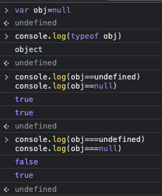 자바스크립트에는 '없음'을 나타내는 값에 undefined와 null 2가지가 있다. undefined는 사실 사용자가 지정할수도 있겠지만, 보통 자바스크립트 엔진이 값이 존재하지 않을 때 자동으로 부여하게 된다. 값을 대입하지 않아서 데이터 영역의 메모리 주소를 지정하지 않은 식별자에 접근할때, 객체 내부에 존재하지 않는 프로퍼티에 접근하려할때, return문이 없거나 호출되지 않는 함수의 실행결과에는 undefined가 부여된다. null은 '비어있음'을 명시적으로 나타내고 싶을때 사용자가 할당하는 값이다. 이 두가지를 혼용하지 않기 위해서는 undefined를 명시적으로 할당하지 않기만하면된다. 다만, null을 쓸때 주의할점은 typeof(null)은 object라는 결과를 반환하는 자바스크립트 버그있기때문에 어떤 변수값이 null인지 확인하기 위해서는 동등연산자가 아닌 일치연산자로 비교를 해주어야한다.