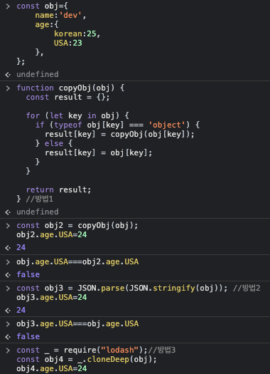깊은 복사를 하기위해서는 1) 깊은복사를 시행하는 재귀함수를 생성 2)String을 Json으로 변환 3) loadash 라이브러리를 사용 이렇게 3가지 방법이 있다.